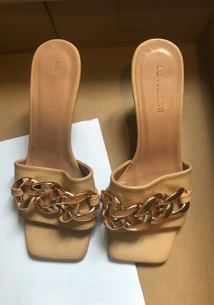Bej renkli, blok topuklu kadın terlik. Parlak zincir detayları olan, kauçuk malzemeden yapılmış minimalist ve çağdaş tasarım.