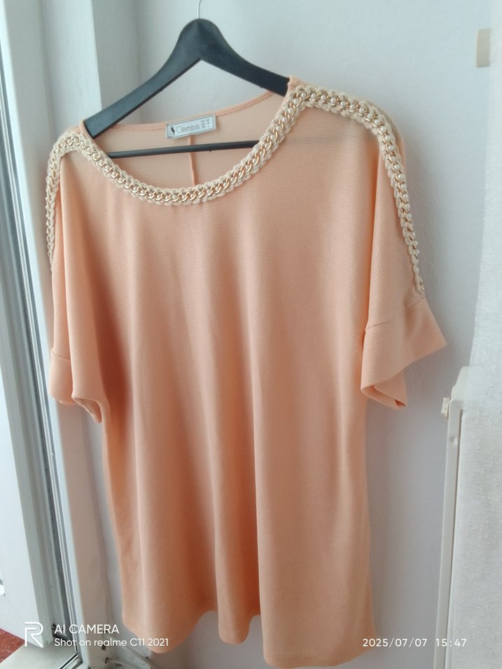 Bej renkte, zincir detaylı yuvarlak yakalı kısa kollu triko bluz. Salaş ve kısa kesim, günlük rahat kullanıma uygun.