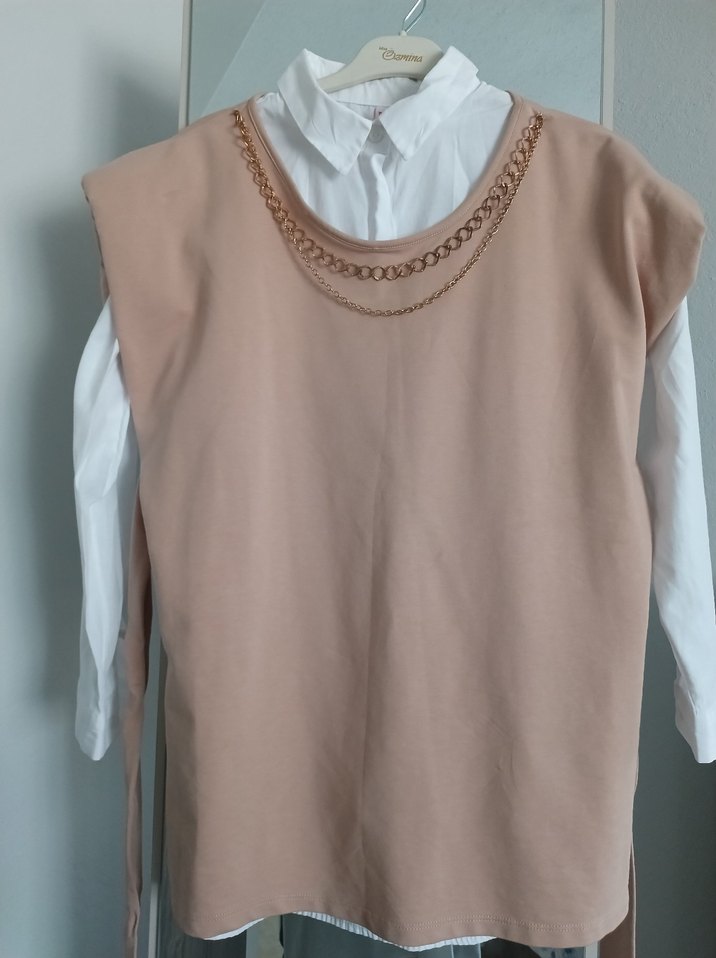 Bej renkli, zincir detaylı, kolsuz ve yakalı, rahat kesim bluz. gömlek dahil degil