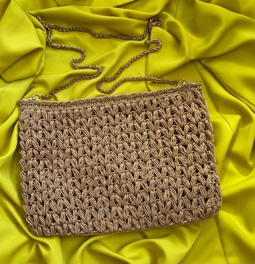 Bej renkli, zincir askılı ve işlemeli desenlere sahip örgü dokulu bohem çanta. El yapımıdır.