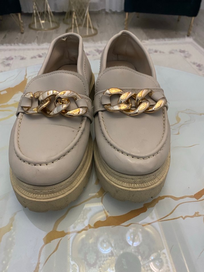 Bej renkte, platform topuklu kadın loafer ayakkabı. Altın zincir detaylı ve yılan derisi desenli, kauçuk malzemeden üretilmiştir. Günlük kullanıma uygundur.