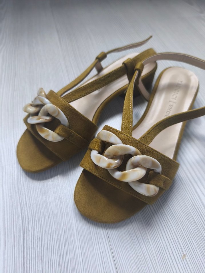 Bej süet malzemeden, blok topuklu kadın sandalet. Parlak yılan deseni ve zincir detayları ile günlük şık tarz için uygundur. 1 kez giyildi