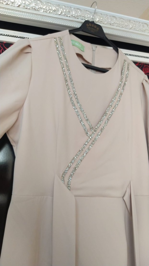 Bej renkli, V yakalı uzun abiye elbise, zincir işlemeli detaylara ve askılı kollara sahiptir. Parlak ve çağdaş tasarımıyla klasik zarafeti yansıtır. ✨