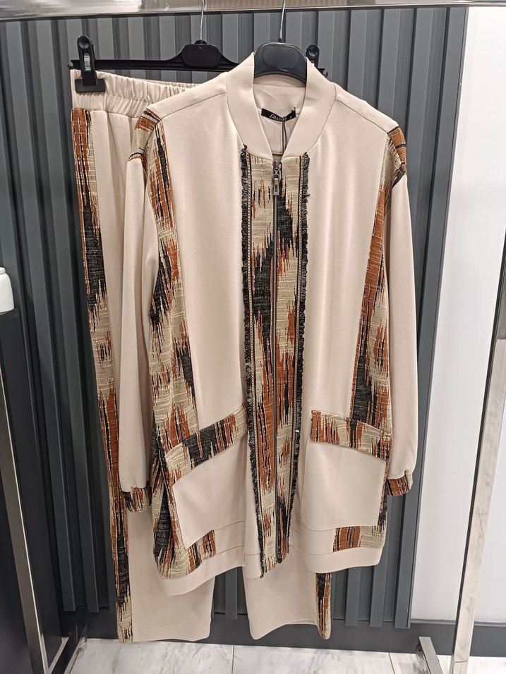 Bej renkli, uzun ve regular fit kadın takımı, zincir detayları ve gri tonlarda tie-dye desen ile modern bir tarz sunar. Uzun kollu ve yuvarlak yaka tasarıma sahiptir.
