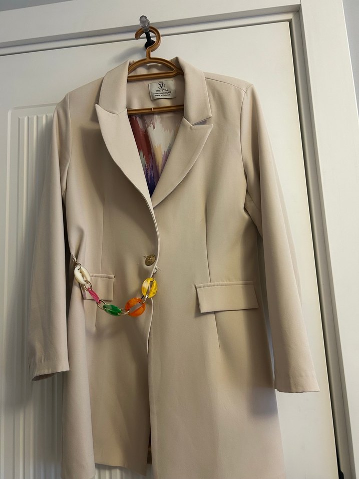 Bej renkte, zincir detaylı, uzun kesim kadın blazer. Ve pantolon Notched lapel yaka, strappy kollar ve tie-dye desenli iç astar içerir. Ofis ve sokak stiline uygun. Blazer ceket M beden kusursuz Pantolon 40 beden Pantolonun alt kısmında çok mınık Bı leke var fotoğraf da mevcut gecebılır makınam temız yıkamıyor ama net gecer dıyemem