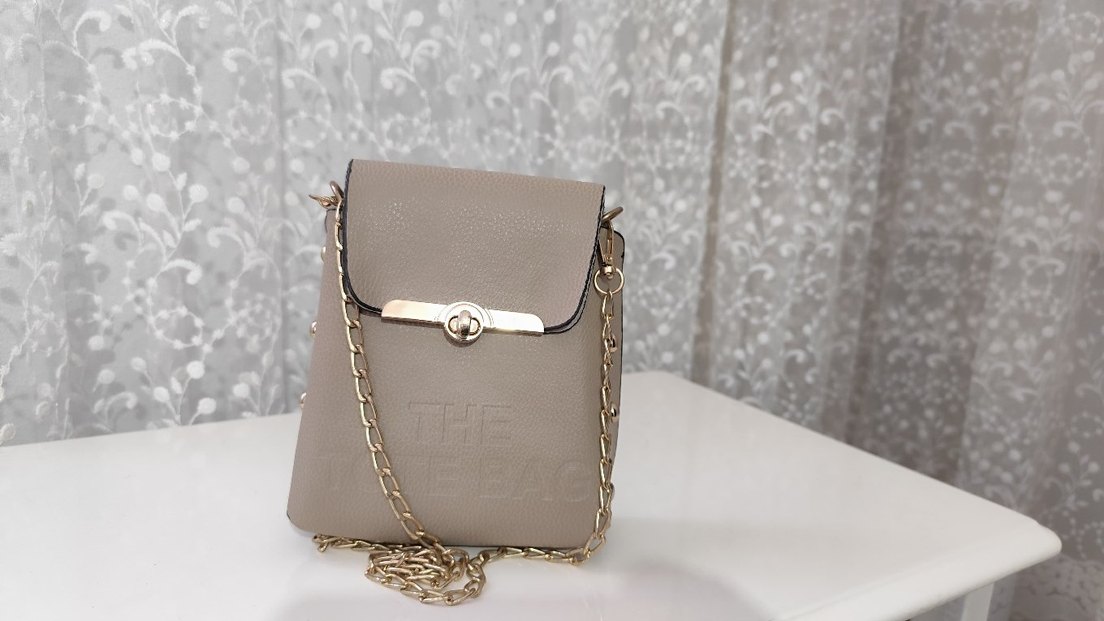 Bej renkli deri çanta, yılan desenli ve zincir detaylıdır. Modern klasik tarzıyla günlük kullanıma uygundur.