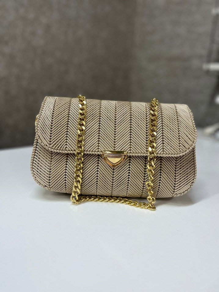 Bej Zincir Detaylı Yılan Desenli Kadın Çanta