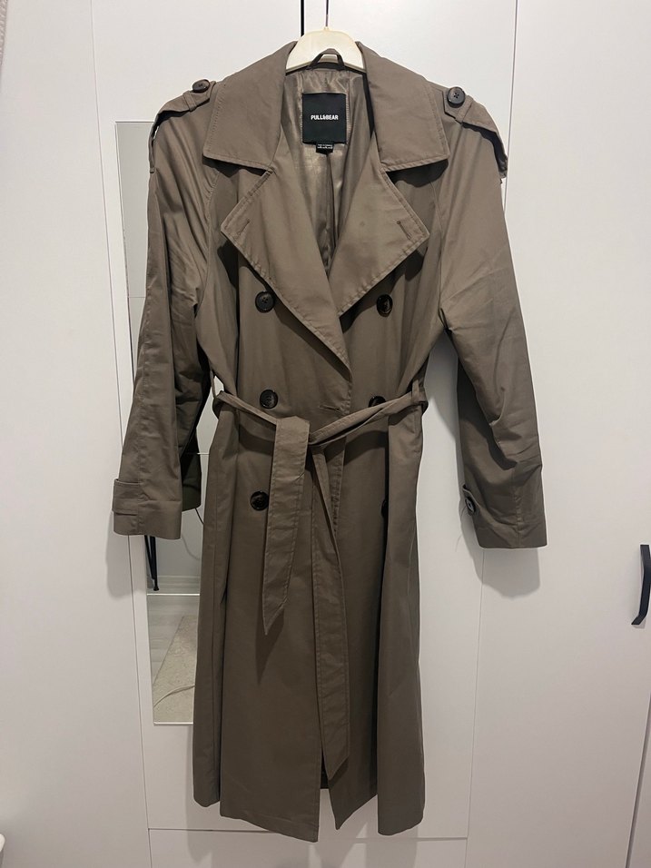 Bej renkli, kemerli uzun trençkot. Notlu yaka, uzun kollu ve düz desensiz. Ofis ve günlük kullanıma uygun rahat kesim. Mükemmel bi kalitesi var ama ben zayıfladığım için bana biraz büyük oluyo bedeni xl ama l beden giyen biri de çok rahat giyebilir kalıbı harika Şuan 68 kiloyum ama 75 ile 85 kilo aralığında çok rahat giyiyodum bilginiz olsun
