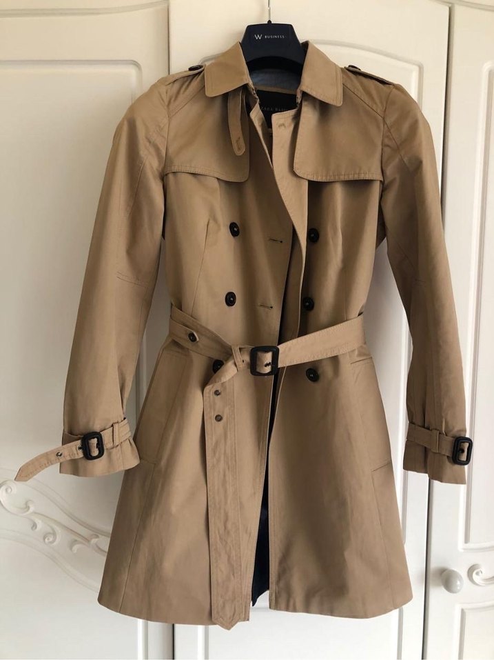 Bej midi trençkot, kesik yaka, düğmeli ön ve uzun kollu. Günlük sokak stili için Paris havası taşıyan rahat kesim.Çok az kullandım ,hasarsızdır.Dar kalıp olduğundan S-M beden arası iseniz rahat olur.