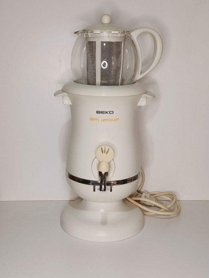 Beko beyaz çay makinesi, cam demliği ve kolay servis için musluklu. Süzgeçli cam demliği sağlam sapı bulunur.
