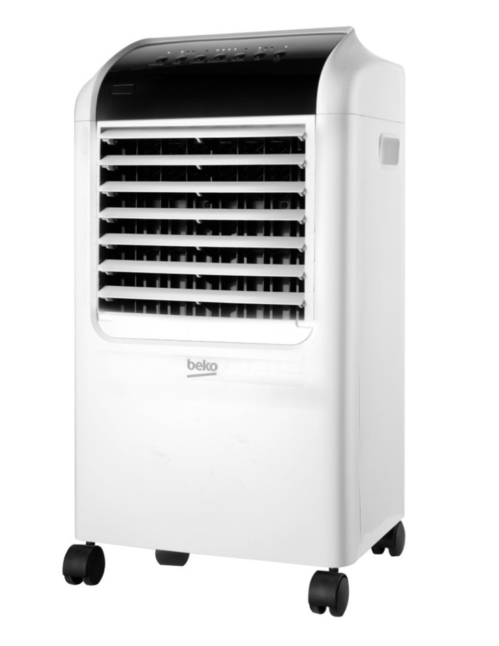 Beko taşınabilir vantilatör, beyaz ve gri renkte, ayarlanabilir panjurlu ve kolay hareket için tekerlekli tasarıma sahiptir.