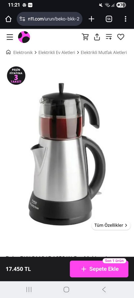 Beko inox paslanmaz çelik çay makinesi. cam demliği ve gri tabanı ile çay makinesi. Siyah kulp ve kapak detayları bulunur, çay demlemek için pratik ve şık bir ürün. ☕demlik sonradan alındı.