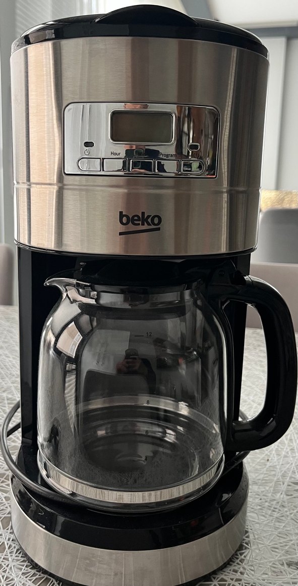 Beko kahve makinesi, gri renk, cam sürahi ve dijital kontrol paneli ile kolay programlama sunar. ☕