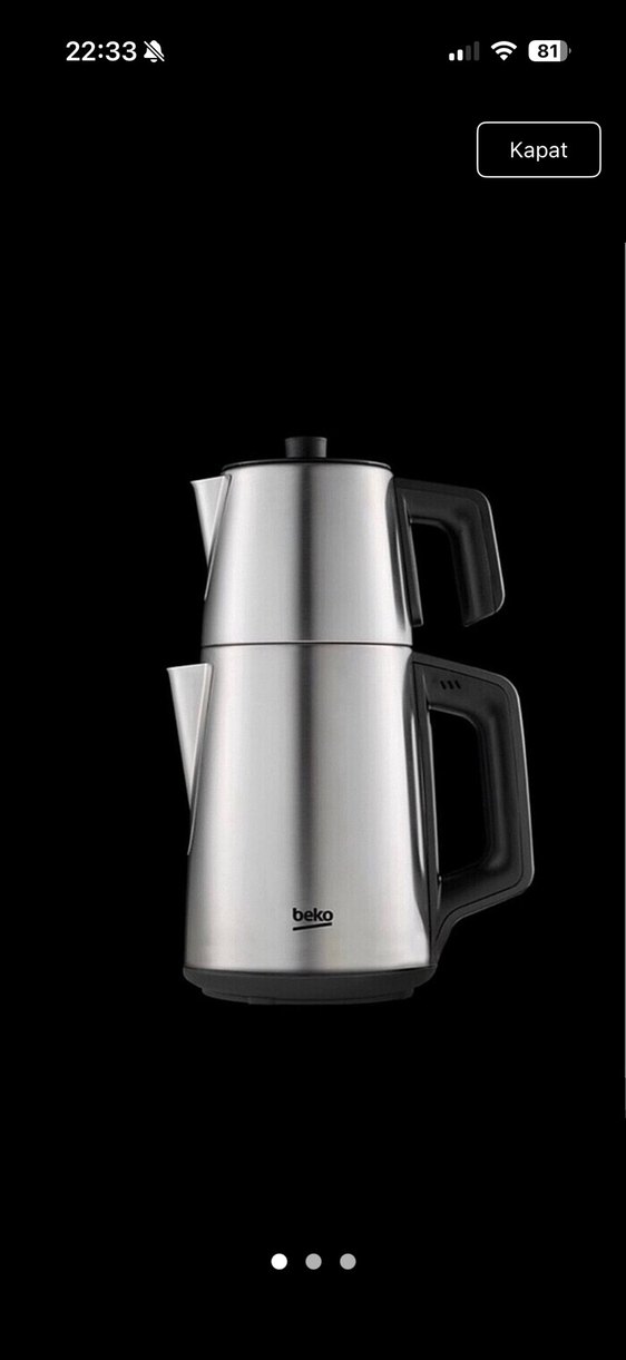 Beko çay makinesi, gri ve siyah renklerde, dayanıklı tutma sapına sahip. Çay demlemek için su ısıtıcısı ve demliği bulunur.