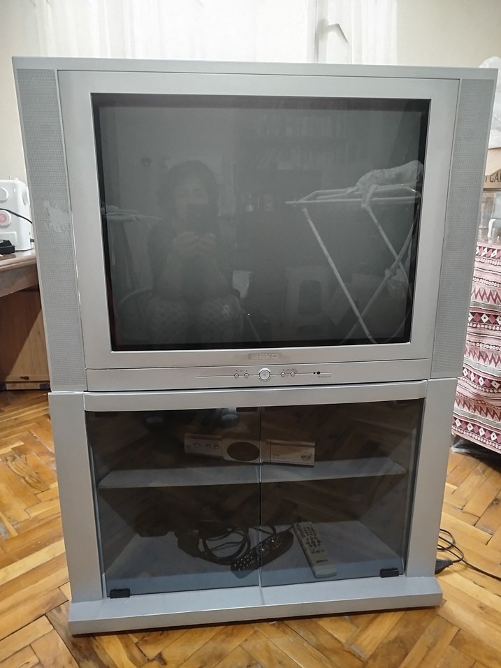 Beko tv ve ünitesi .Gri renkli CRT monitör, altında cam kapaklı dolap ve raflarla depolama alanı sunar. Ekranın altında kontrol düğmeleri bulunur. Çok az kullanılmış