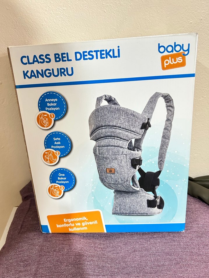 Bu gri ergonomik bebek kangurusu, bel destekli olup anne ve bebek için ayarlanabilir pozisyonlarla konforlu ve güvenli kullanım sağlar. HİÇ KULLANILMADI