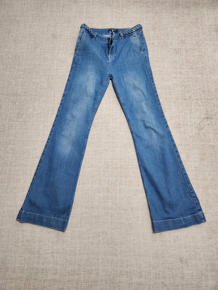 Bel detaylı, bol kesim kadın kot pantolon. Normal midi boyda, günlük, retro tarzı sunar.