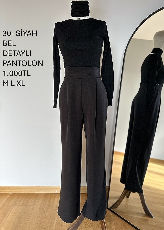 Bel Detaylı Bol Paça Kumaş Pantolon, Siyah Renk. (SATIN ALMAK İSTEDİĞİNİZ BEDENİ LÜTFEN MESAJLA BELİRTİN, YENİ İLAN AÇALIM) Şuan, 1 adet L, 1 adet M, 1 adet XL beden mevcuttur. Etiketli, kullanılmamış. İş değişikliğinden dolayı elimizdeki ürünleri uyguna satıyoruz. İade ve Değişim yapamıyoruz, anlayışınız için teşekkürler. Mağazalar ve satıcılar diğer kadın giyim tekstil ürünlerimize lütfen bakınız, toptan alınacaksa uygun fiyata bırakacağız. Teşekkürler.
