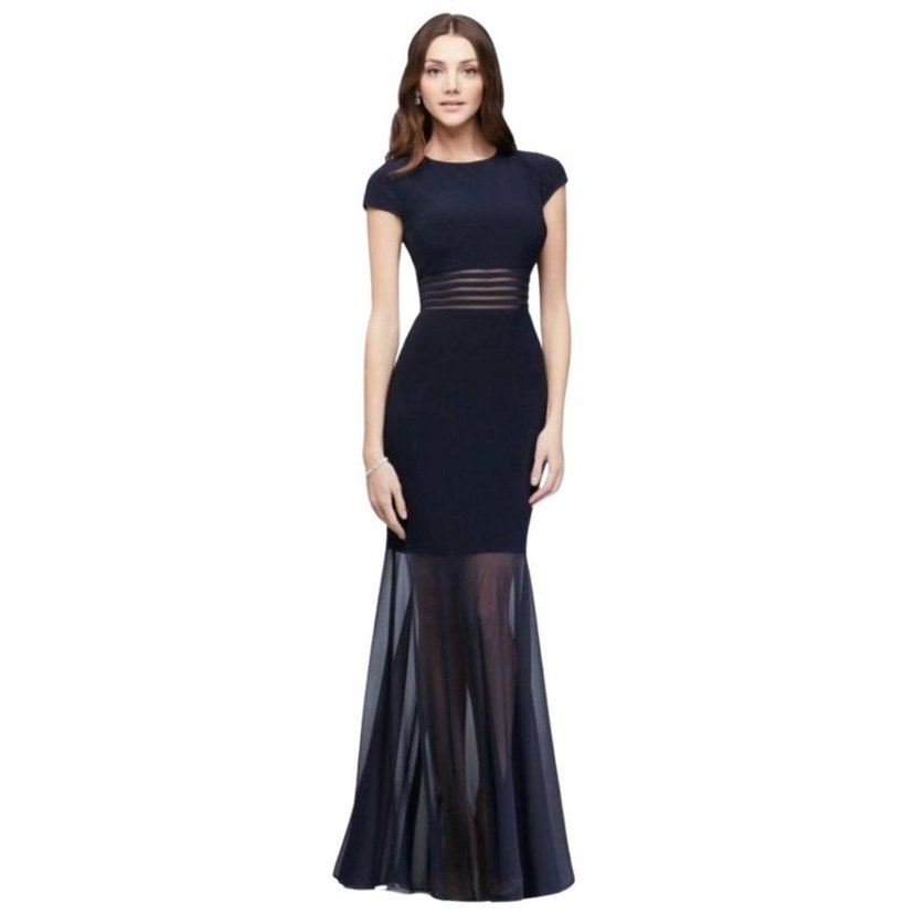 Lacivert renkli, uzun ve vücuda oturan abiye elbise. Kayık yaka, ince askılı ve pileli detaylara sahip, alt kısmı transparan, düğünler için uygun.
