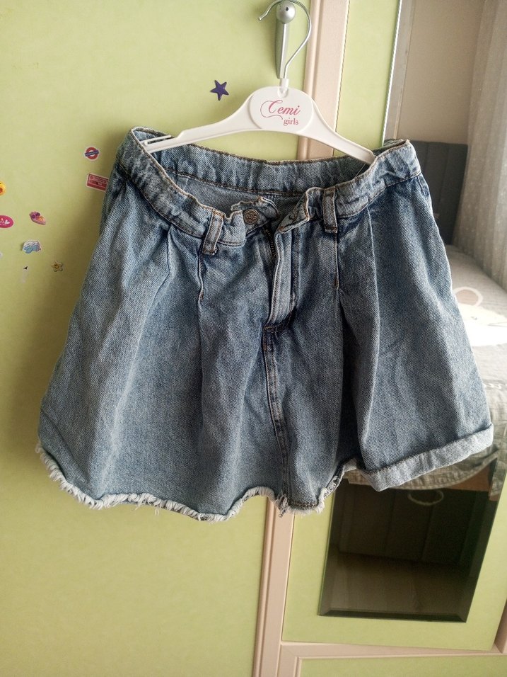 Bel detaylı, bol kesim mavi mini denim şort, günlük rahat sokak stiline uygundur. Desensiz ve kısa boydadır.