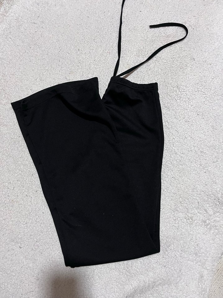 Siyah, midi boy, kumaştan üretilmiş, ispanyol kadın pantolon. Günlük sokak stili için rahat ve şık bir tercih.