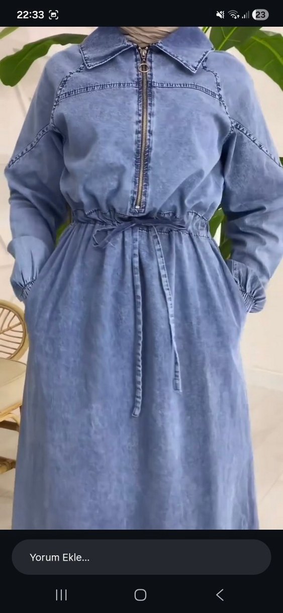 Bel detaylı, yakalı ve uzun kollu mavi denim elbise. Salaş kesimi ve hafif batik deseniyle günlük kullanıma uygun.