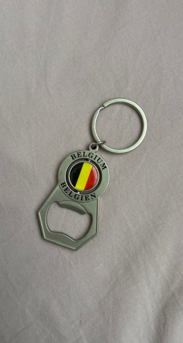 Metal şişe açacağı ve renkli Belçika bayrağı sembolü bulunan, "BELGIUM BELGIEN" yazılı hatıra anahtarlık. Biker ve retro tarzlara uygun.