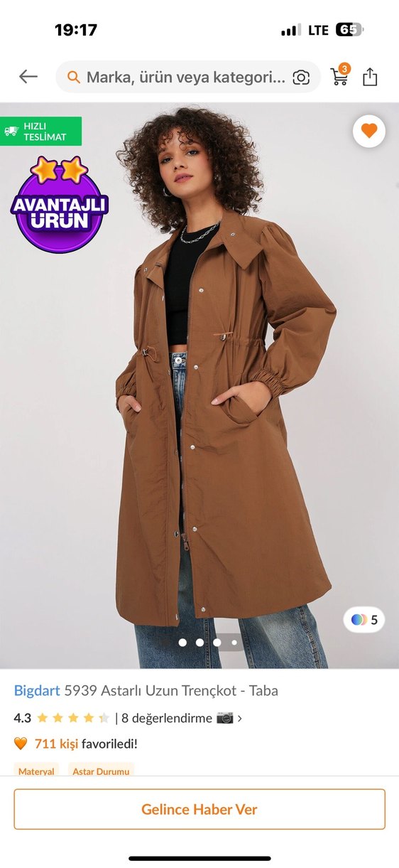 Beldeli, uzun kahverengi trençkot, notalı yakalı ve uzun kolludur. Rahat kesimi ve günlük sokak stiliyle sentetik kumaştan üretilmiştir.
