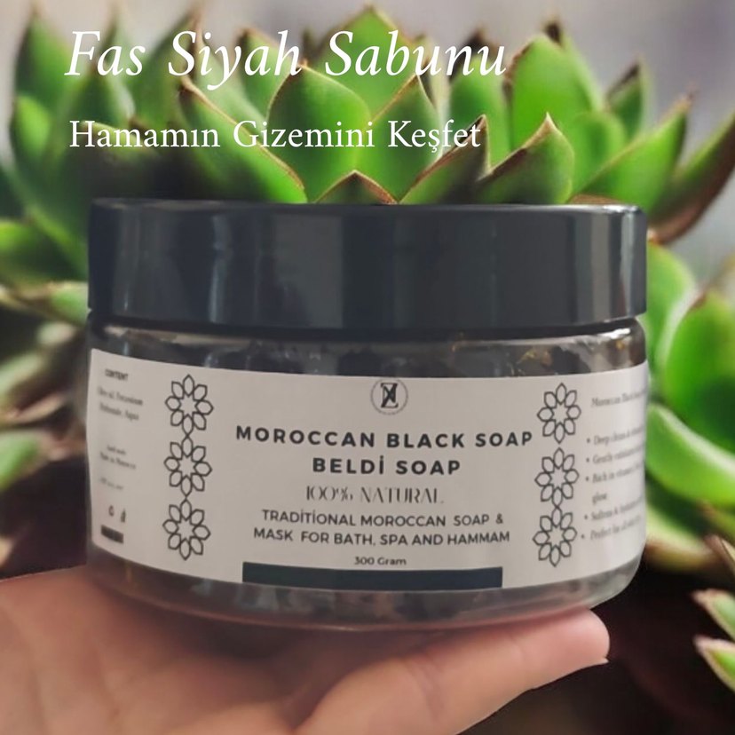 Beldi Sabunu, 300 gramlık kutuda, banyo, spa ve hamam için kullanılan %100 doğal Fas siyah sabunudur.