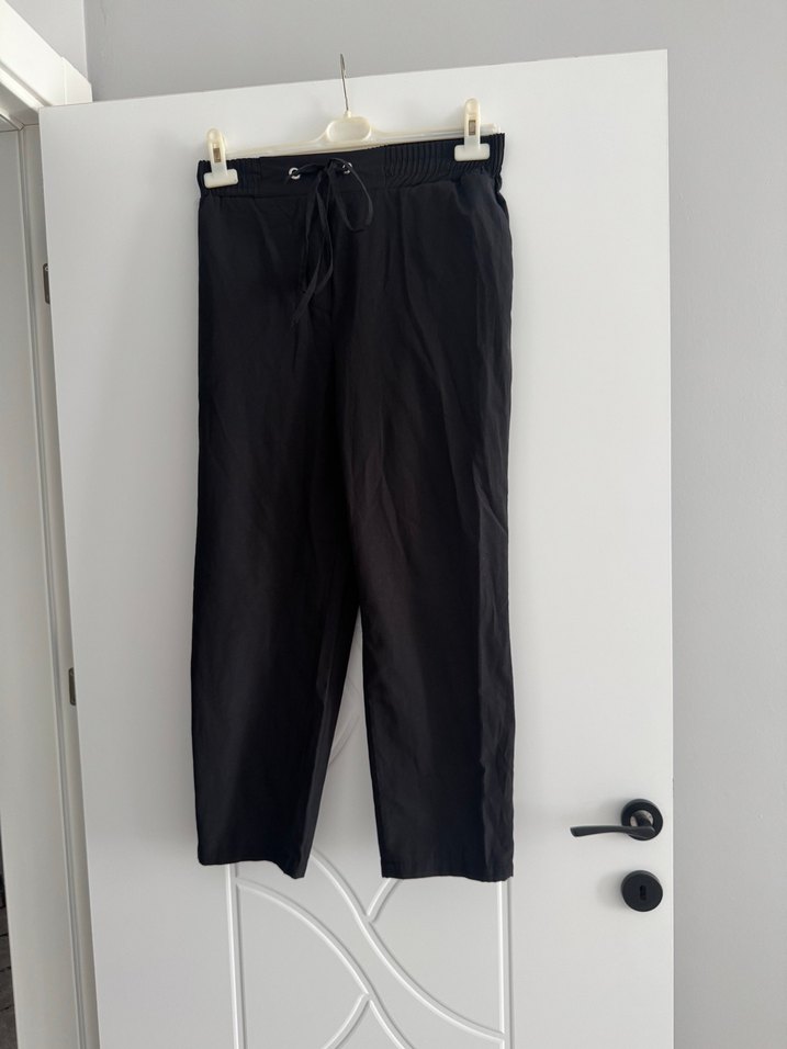 Beli bağcıklı, midi boy, bol kesim siyah keten pantolon. Rahat ve şık, günlük dış mekan kullanımı için uygun.