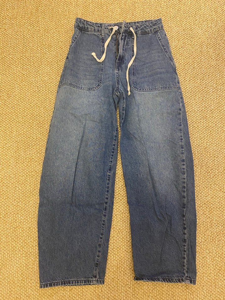 Beli bağlamalı, parlak mavi renkte, bol kesim kadın kot pantolon. Midi boyda, günlük kullanım için uygun rahat ve sokak stili pantolon. 34 beden.