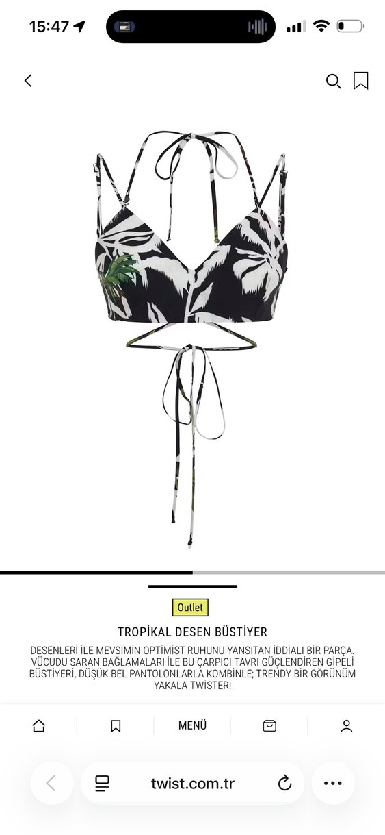 Mevsimin canlı ruhunu yansıtan tropikal desenlere sahip, beli bağlamalı ve vücudu saran askılı kısa büstiyer. Cesur avant-garde tarzıyla dikkat çeker.