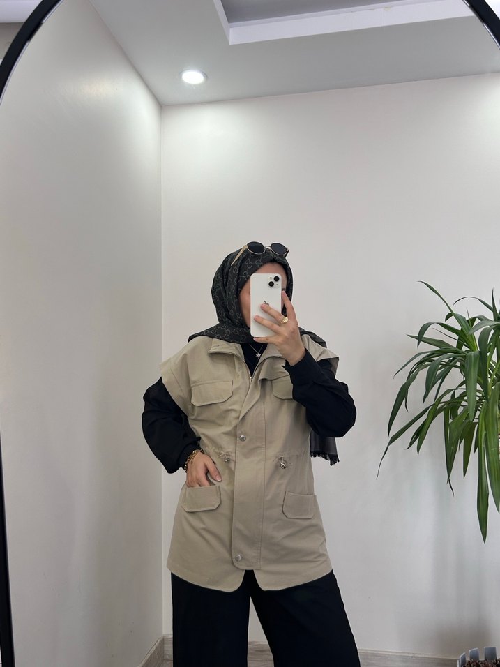 Büzgülü yelek S m bedenleri mevcut Bej renkli midi parka, yumuşak ve sıcak kumaştan, uzun kollu ve boğazlı yaka tasarımıyla rahat bir kesime sahiptir. Ön cepleriyle günlük kullanıma uygundur.