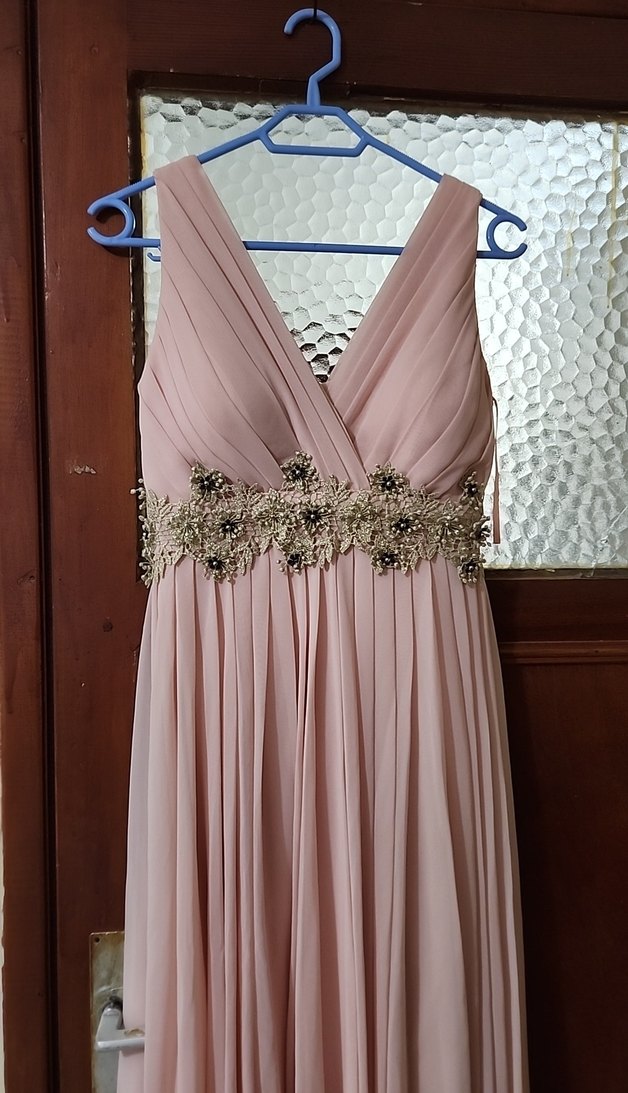 beli işlemeli pudra pembesi abiye
