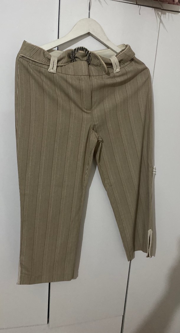 Bej renkli keten kumaştan, beli kemerli ve normal kesim midi boy kadın pantolon. İnce çizgiler ve yan yırtmaç detayına sahiptir, ofis için uygundur.