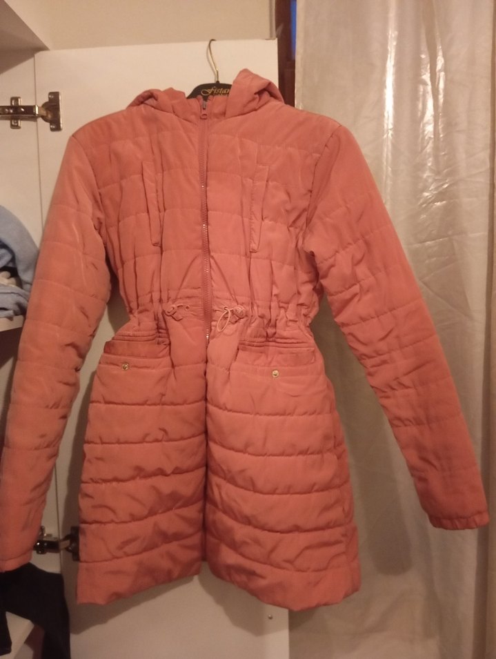 Beli kemerli, midi uzunlukta, fitted kesim kışlık mont. Sentetik yumuşak kumaştan, notched lapel yaka ve askılı kollara sahip. Günlük rahat kullanım için uygun, pastel bej tonunda. bı kaç lekesi var cikarmi bilmiyorum resimdelerde mevcut görüldü gibi ❄️