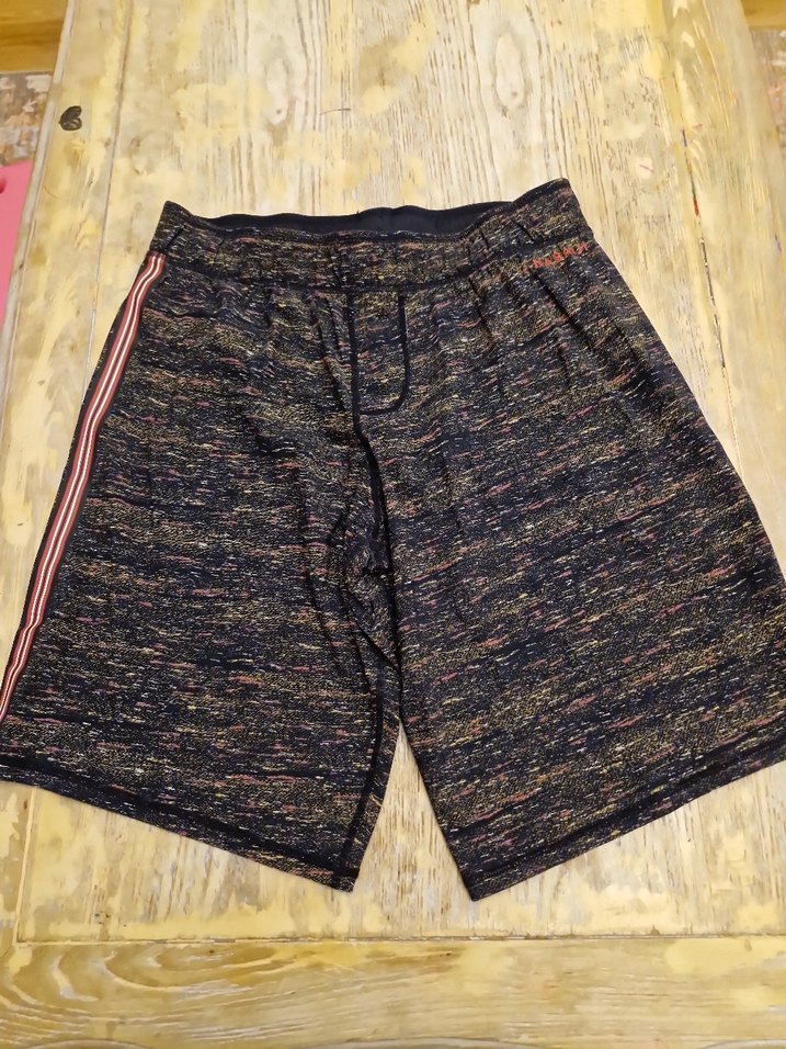 Beli kemerli, kısa boy, çok renkli erkek şort. Sentetik kumaştan, rahat ve spor tarz için uygun.
