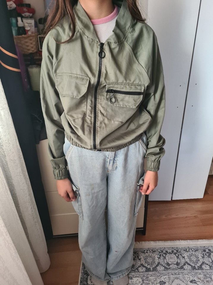 Kadın ceket, bol kesim, uzun kollu ve yüksek yakalıdır. Denim kumaştan yapılmış, belde kemer ve önünde fermuar bulunur. Gri renkte, gündelik kullanıma uygun midi boydadır.