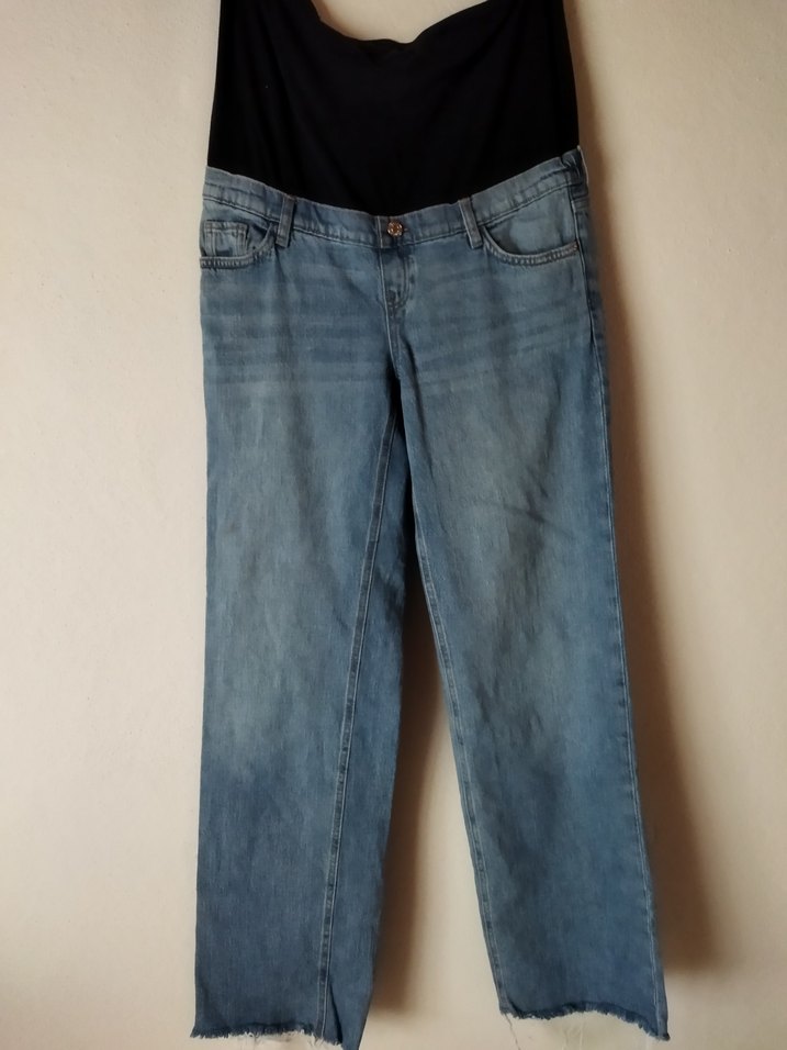 Beli kemerli, bol kesim hamile kot pantolon. Günlük kullanıma uygun, mavi-gri tonlarında ve normal boyda.
