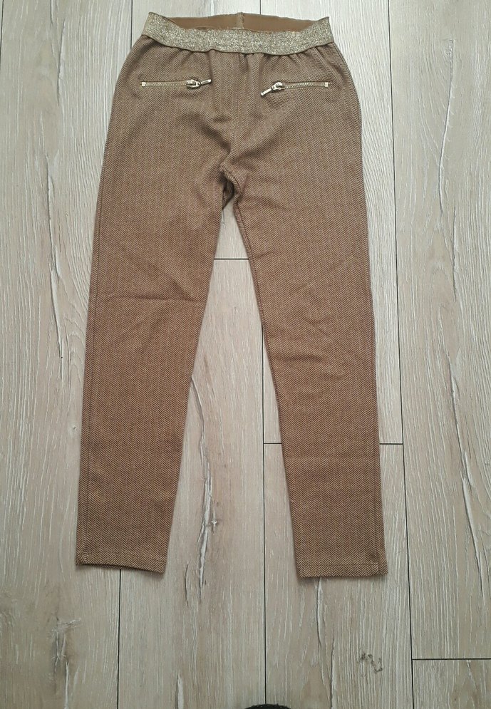 Bej renkli, beli kemerli ve fermuarlı cepli kiz cocuk kumaş pantolon, rahat kesim ve normal boyda, günlük kullanıma uygun.