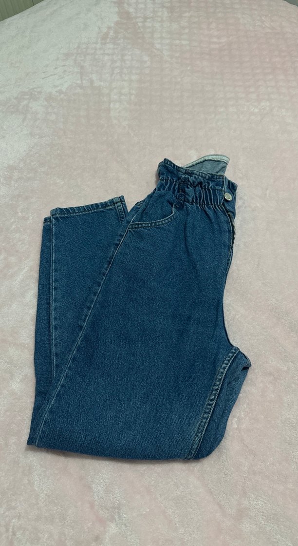 Bu mavi kot pantolon, bol kesim ve kemerli beliyle günlük rahat kullanım için uygundur. Midi boyda ve desensizdir.