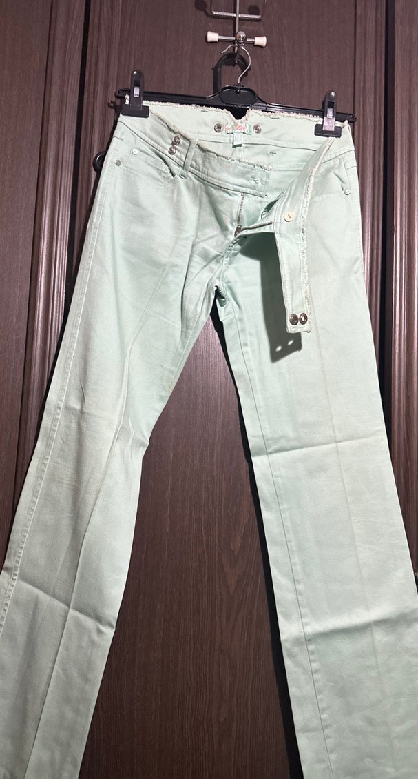 Beli kemerli, yeşil renkli midi uzunlukta regular fit denim pantolon. Günlük rahat sokak stiline uygum. Yurt dışından hiç giyilmedi.