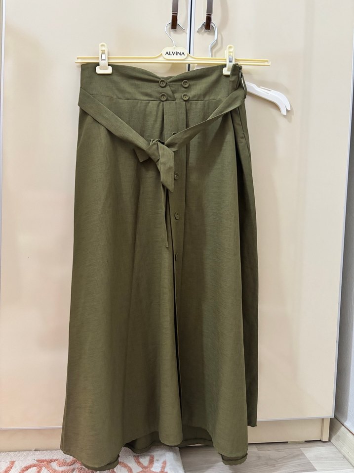 Bu haki renkli, beli kuşaklı ve bol kesim uzun kadın eteği, yumuşak keten kumaştan yapılmıştır. Bohem tarzıyla günlük kullanıma uygundur.