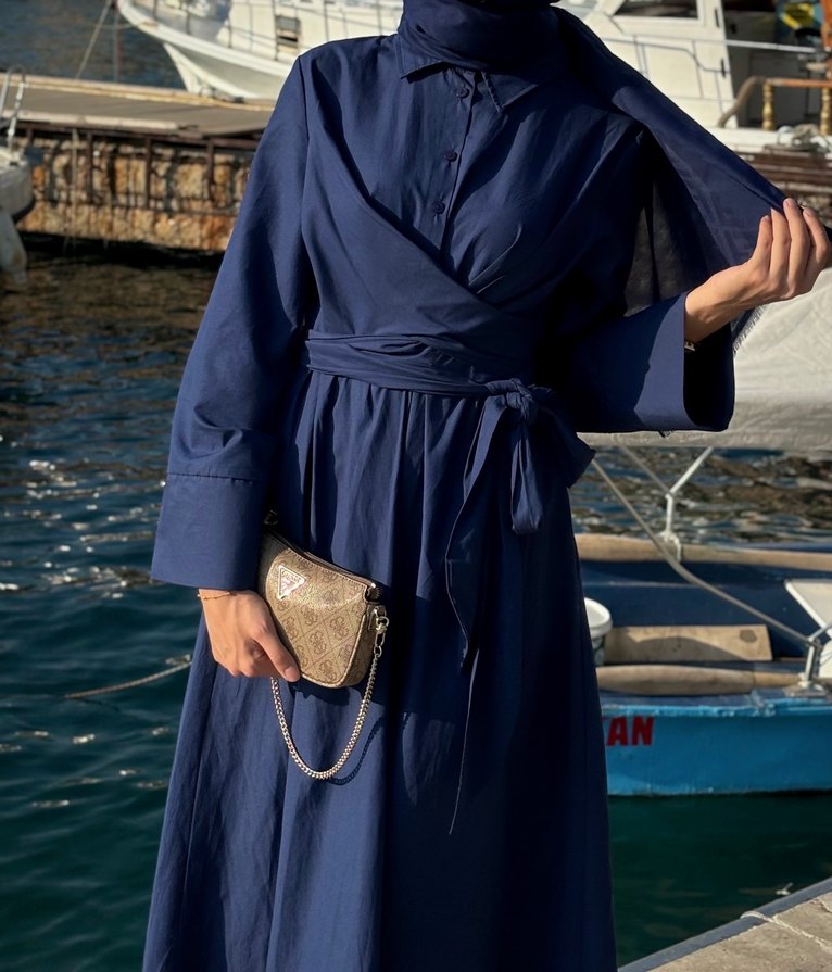 Beli Kuşaklı Lacivert Uzun Elbise