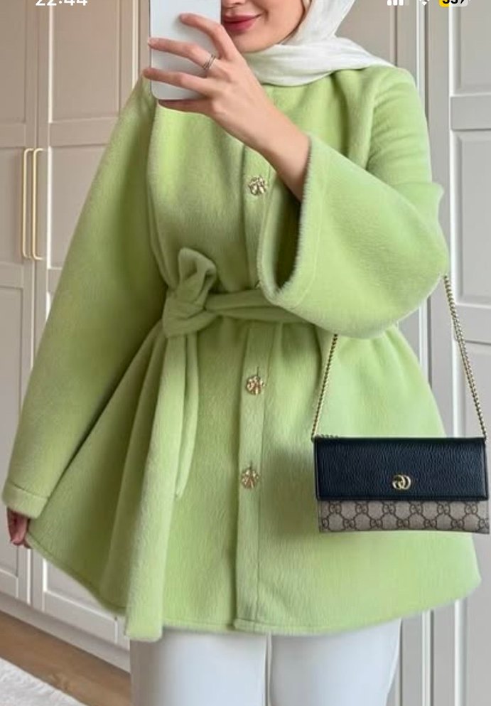 Beli kuşaklı, pastel yeşil kısa kadın kaban sayılı giydim kaban görünümlü kışlık ceket. Düğmeleri eskitme düğme tarzında aldığımda öyleydi. Etiketi 40 yazıyor ama m -L bedenim oluyor