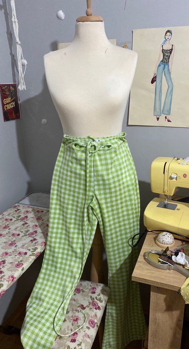 Beli Kuşaklı Yeşil Kareli Kadın Pantolon
