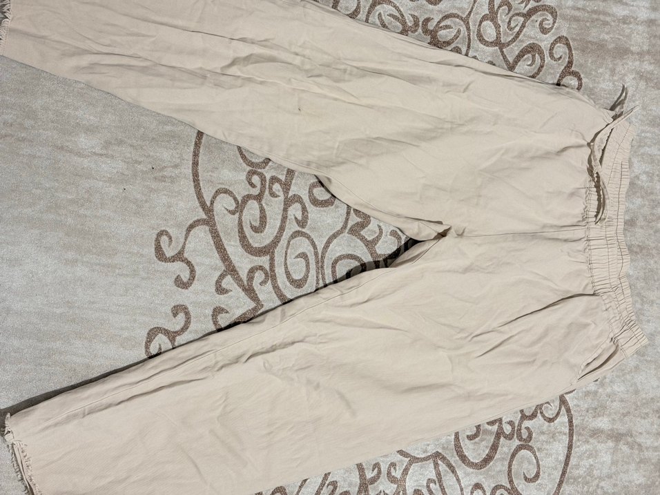 Bej renk beli lastikli paçası püsküllü rahat kumaş pantolon Az kullanıldı dar geldiği için kullanmıyorum V kısmında hafif deforme var iplikler esnemiş gibi görünüyor diz altında minik bir leke var yıkanırsa geçebilir diye düşünüyorum Belden bacağa boy 92 cm bel 52 cm bacak en 25 cm