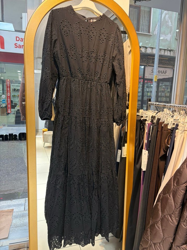 Nakışlı desenlere, uzun kollara ve yuvarlak yaka sahip siyah uzun elbise. Normal kesim, beli lastikli ve sentetik kumaştan, günlük sade kullanım için uygundur.