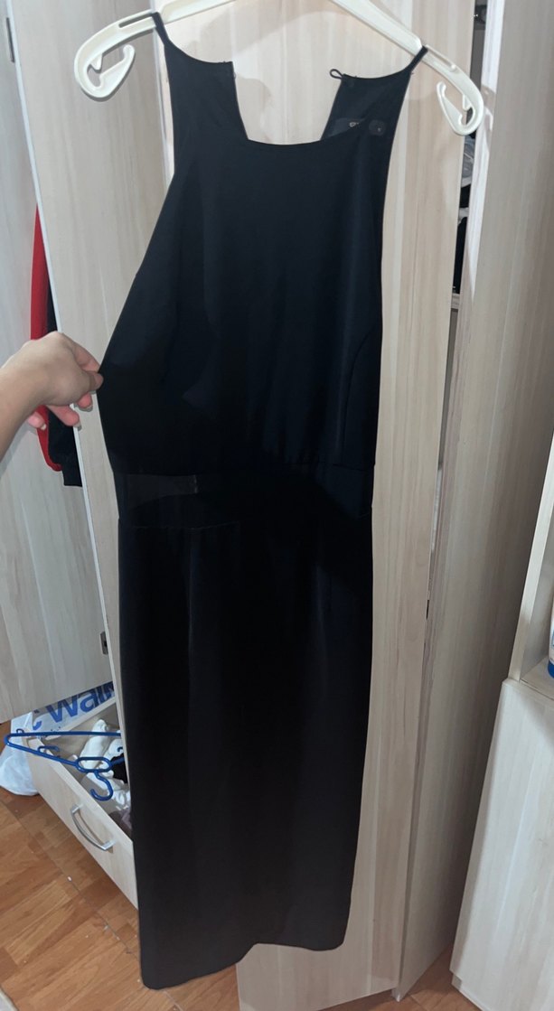 Kemerli, yüksek yakalı, kolu olmayan siyah midi elbise. Ofis için uygun, goth tarzını yansıtan şık bir model.