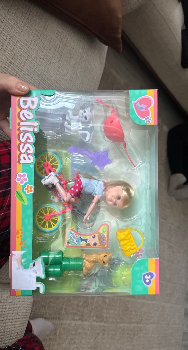 Belissa bebek setinde bisiklet süren bebek, iki evcil hayvan, kask, çanta ve aksesuarlar yer alır. 3 yaş ve üzeri için uygundur.